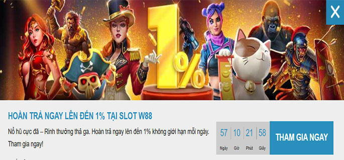 Hơn thế nữa thành viên  có thể nhận tiền hoàn lên đến 1% khi chơi slot tại nhà cái. Cùng W88fans.com theo dõi ngay bên dưới để biết thêm chi tiết khuyến mãi!