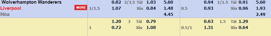 • Mức kèo nhà cái cược chấp trận này: Liverpool chấp 1,25 Trái. Wolves ăn 0,82. Liverpool ăn 1,07